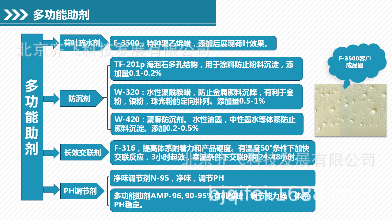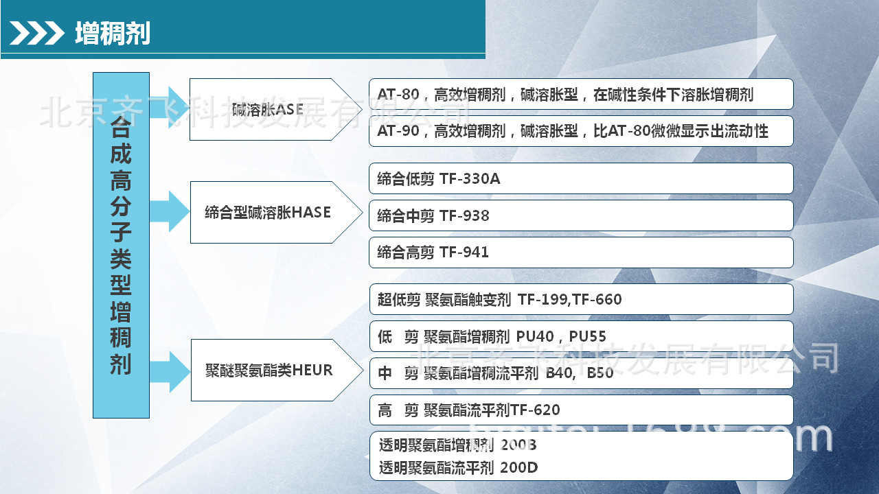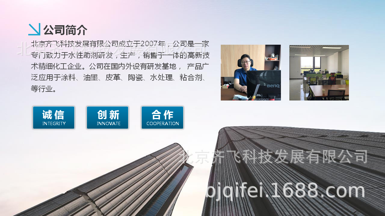 北京91视频下载地址科技发展有限公司始创于2007年,致力于为中国市场提供自主研发的国产高性价比的分散剂、消泡剂、防腐剂、润湿剂、增稠剂、多功能助剂和涂料胶粉;产品加技术服务创立诚实守信的化工助剂民族品牌。