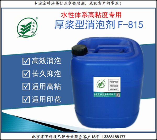 F-815 是一款用于厚浆类型的消泡剂,它具有高效消泡和抑泡功能的消泡剂,具有长效消泡性能。它在水性涂料体系中抑泡、破泡效果突出,尤其适用于辊涂施工的较高粘度的乳胶漆中。